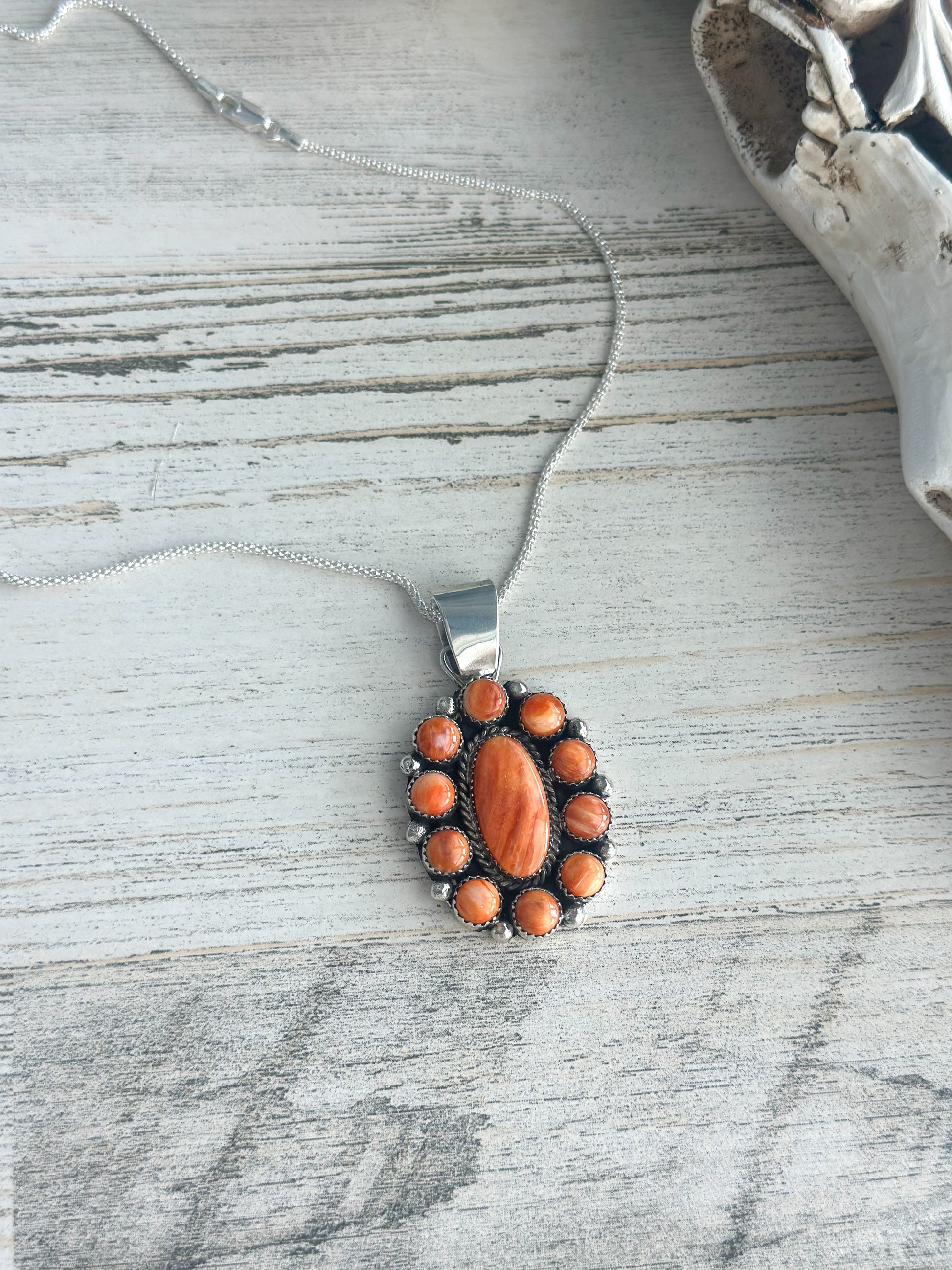 Elevate your jewelry collection with this stunning handcrafted Orange Spiny Oyster Pendant Necklace by renowned Navajo artist Ella Spencer. Carefully crafted in traditional Navajo style, this piece showcases a vibrant orange spiny oyster shell set in sterling silver — a timeless symbol of Native American artistry.