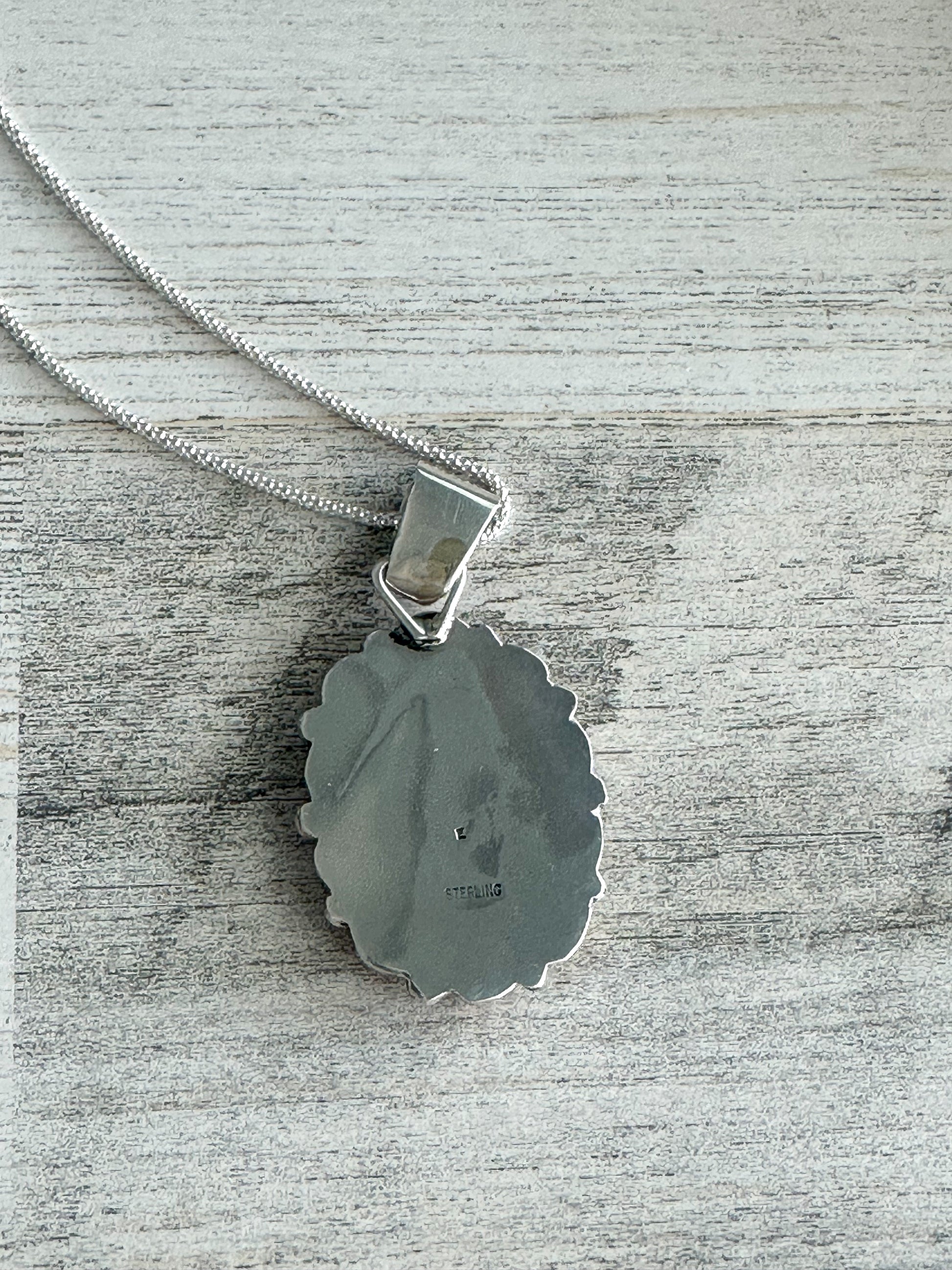 The pendant measures 2-1/8" long (including the bail) and 1-1/8" wide, with a 1/4" bail opening, making it a bold yet elegant statement piece. It comes beautifully paired with a classic 18" sterling silver chain, ready to wear right out of the box.