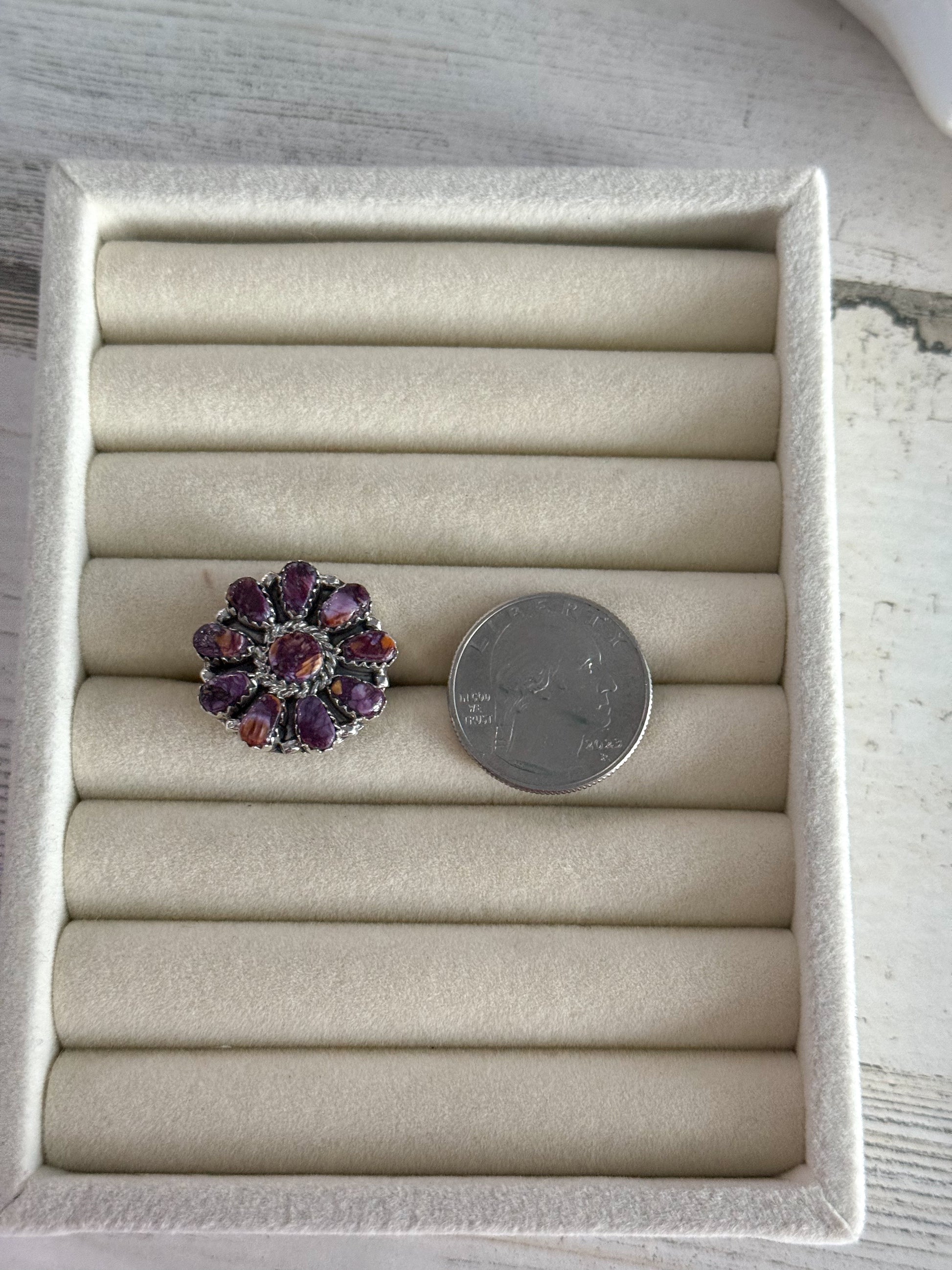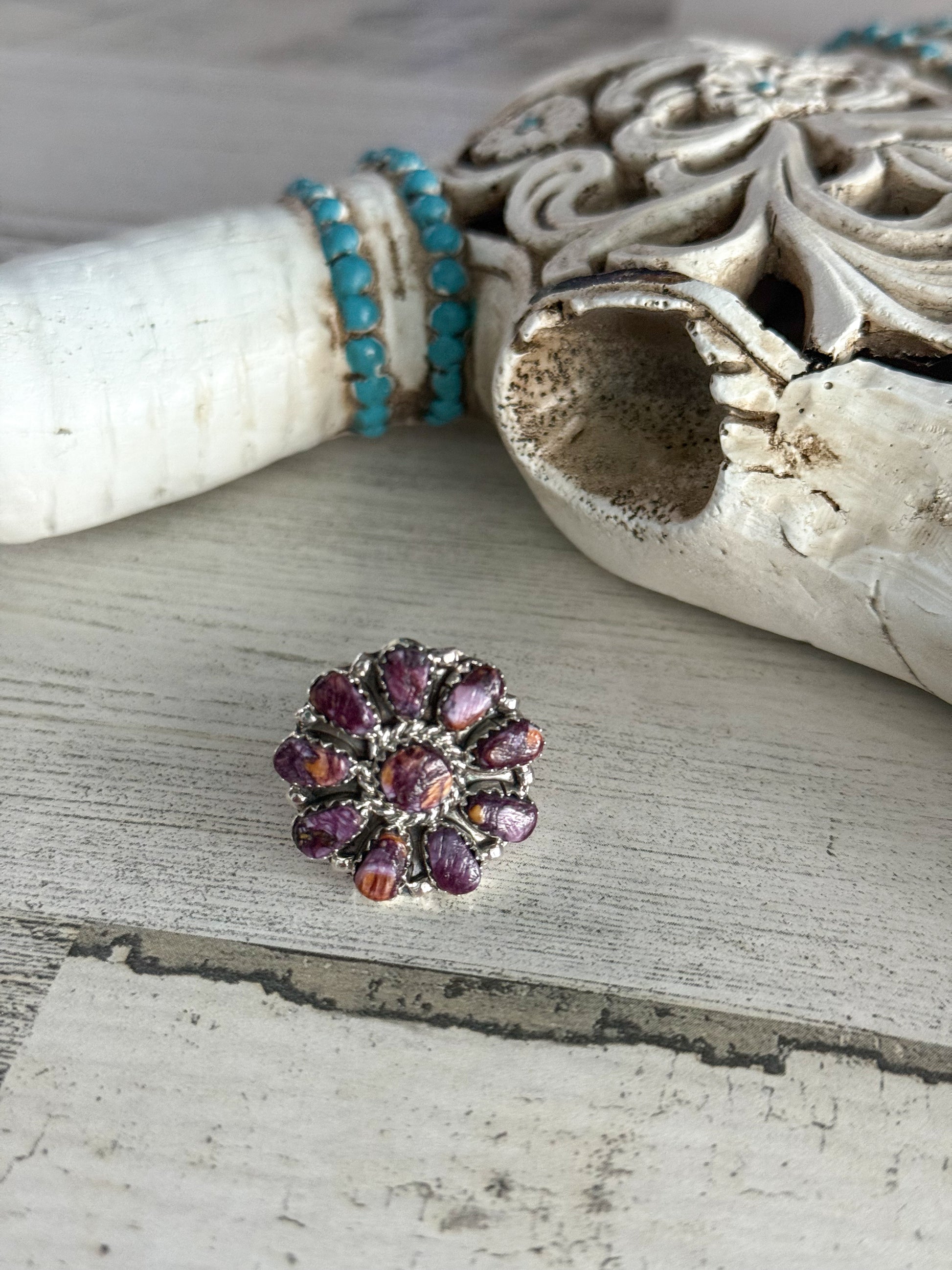 Add a bold touch of color and tradition to your collection with this handcrafted Purple Spiny Oyster cluster ring by Navajo artist Jason Benally. Expertly set in sterling silver, the vibrant purple spiny shells are arranged in a traditional cluster design, showcasing the artistry and heritage of Native silversmithing.