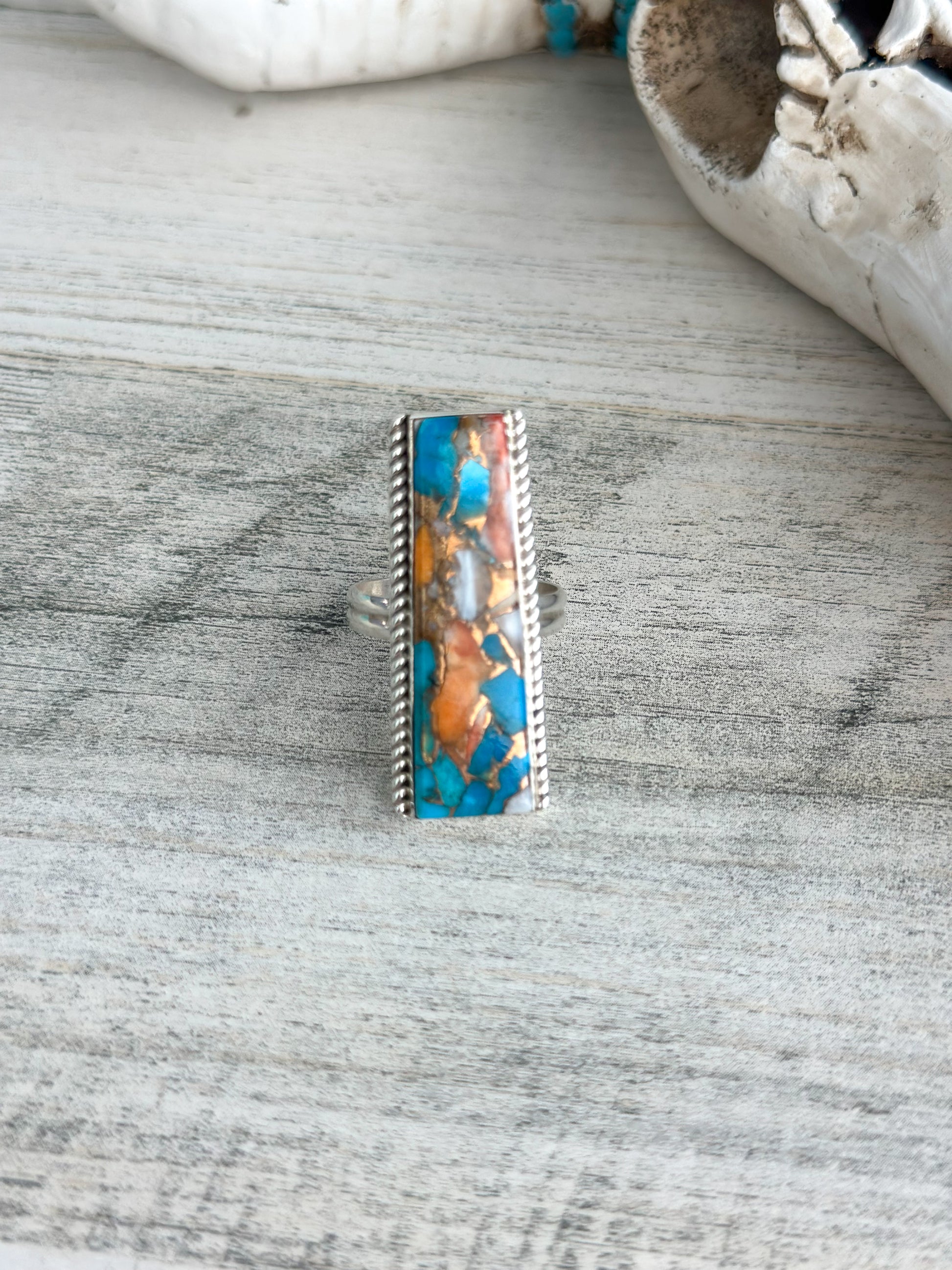 This beautiful size 9 ring features a dynamic blend of orange Spiny Oyster shell and vivid turquoise inlay, creating a bold and colorful contrast. Measuring 1 1/2" long by 1/2" wide, the ring makes a statement while remaining comfortable for everyday wear.