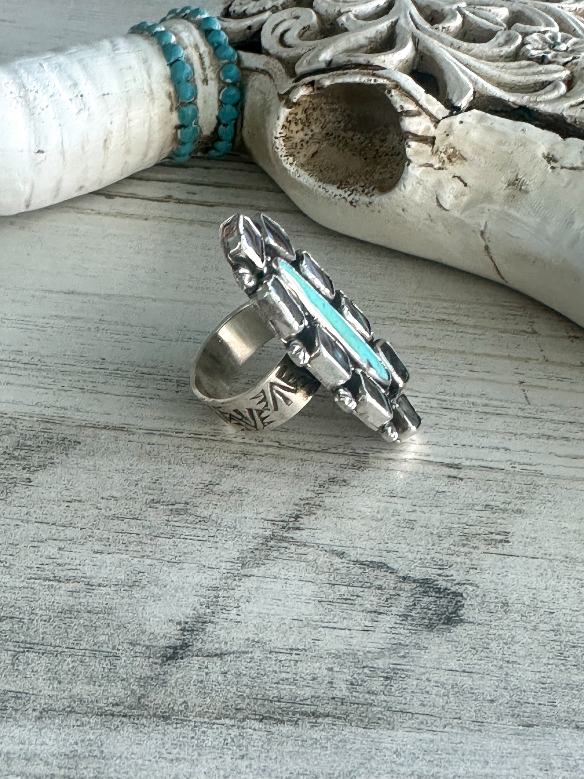 The sterling silver band features intricate hand-stamped detailing, showcasing traditional Navajo silverwork with a modern twist. This ring is signed by the artist, guaranteeing authenticity and quality craftsmanship.