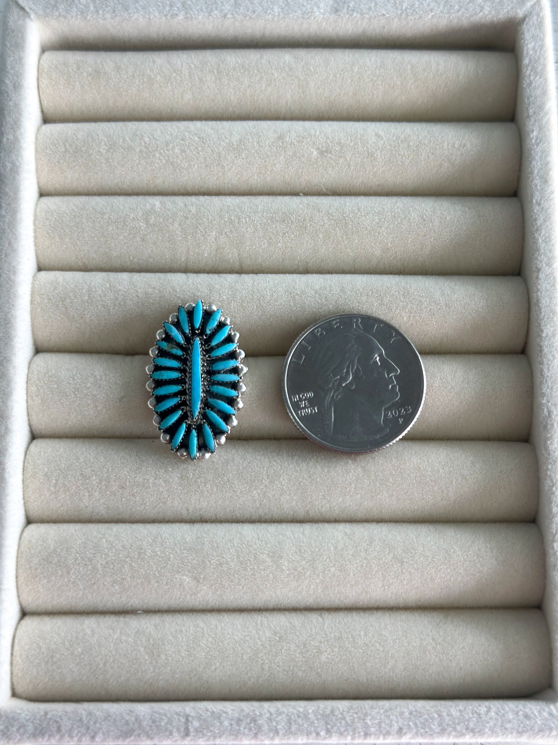 Add a touch of authentic Southwestern charm to your jewelry collection with these Turquoise Cluster Earrings, handcrafted by Zuni artist Lorena Peina. These elegant earrings feature beautifully arranged turquoise stones in a traditional Zuni cluster design, all set in sterling silver.