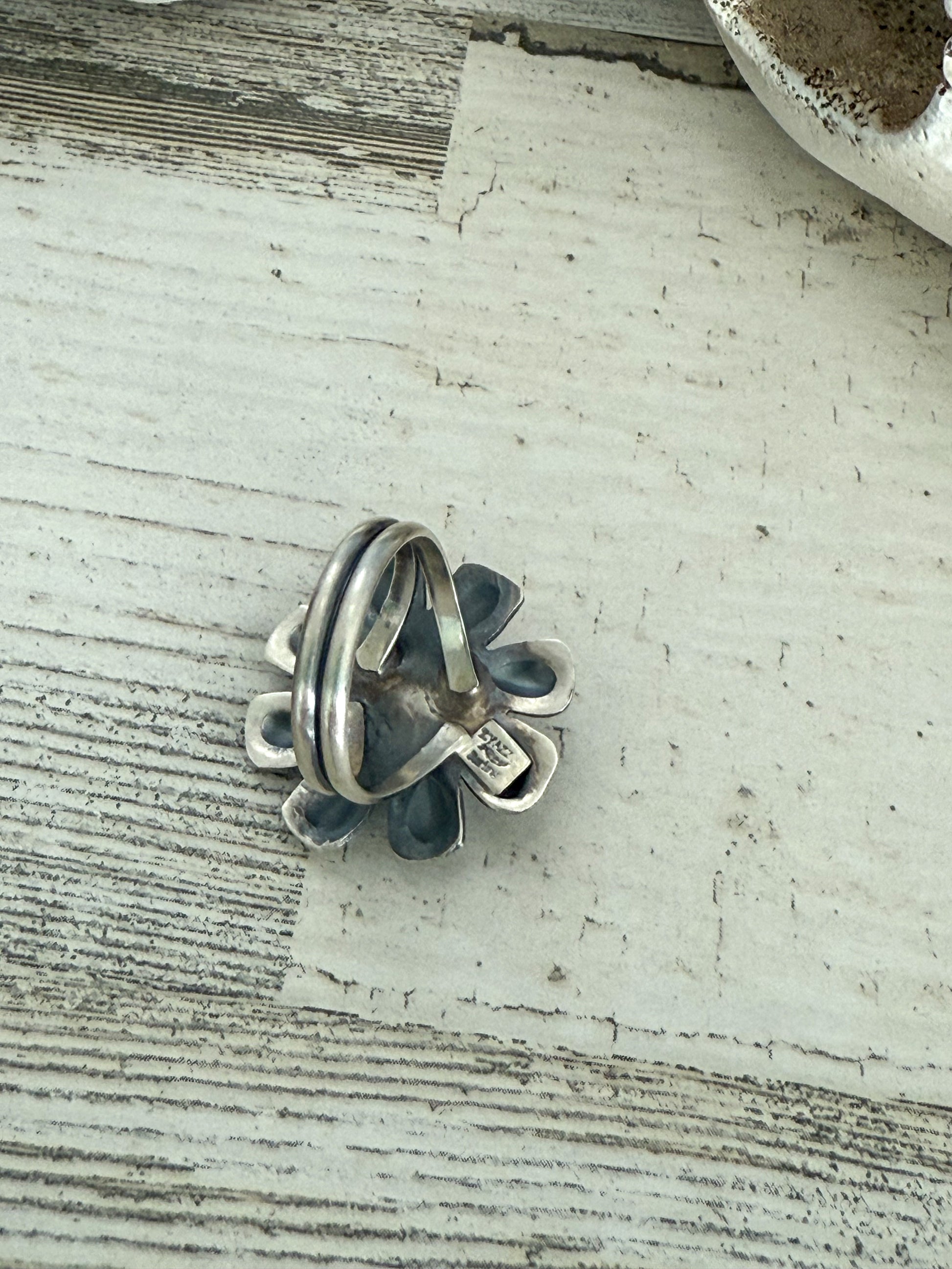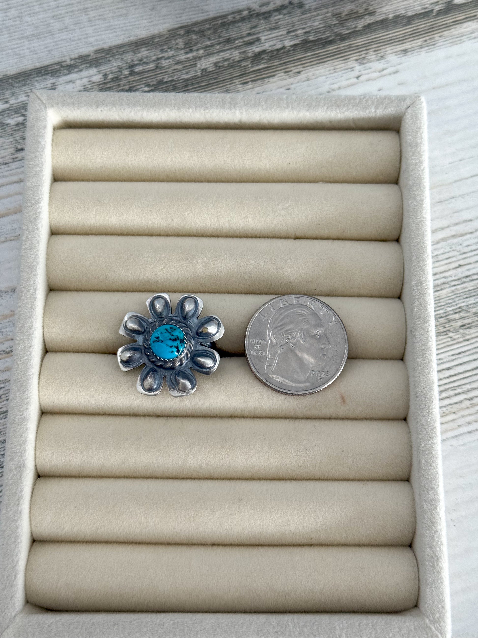 This elegant sterling silver and turquoise flower ring is a handcrafted creation by Navajo silversmith Loretta Chee signed T Yazzie. Loretta is using her husbands stamp until she received her own Featuring a detailed silver flower design set with a genuine turquoise stone, this piece showcases the beauty of natural materials and traditional Navajo artistry.