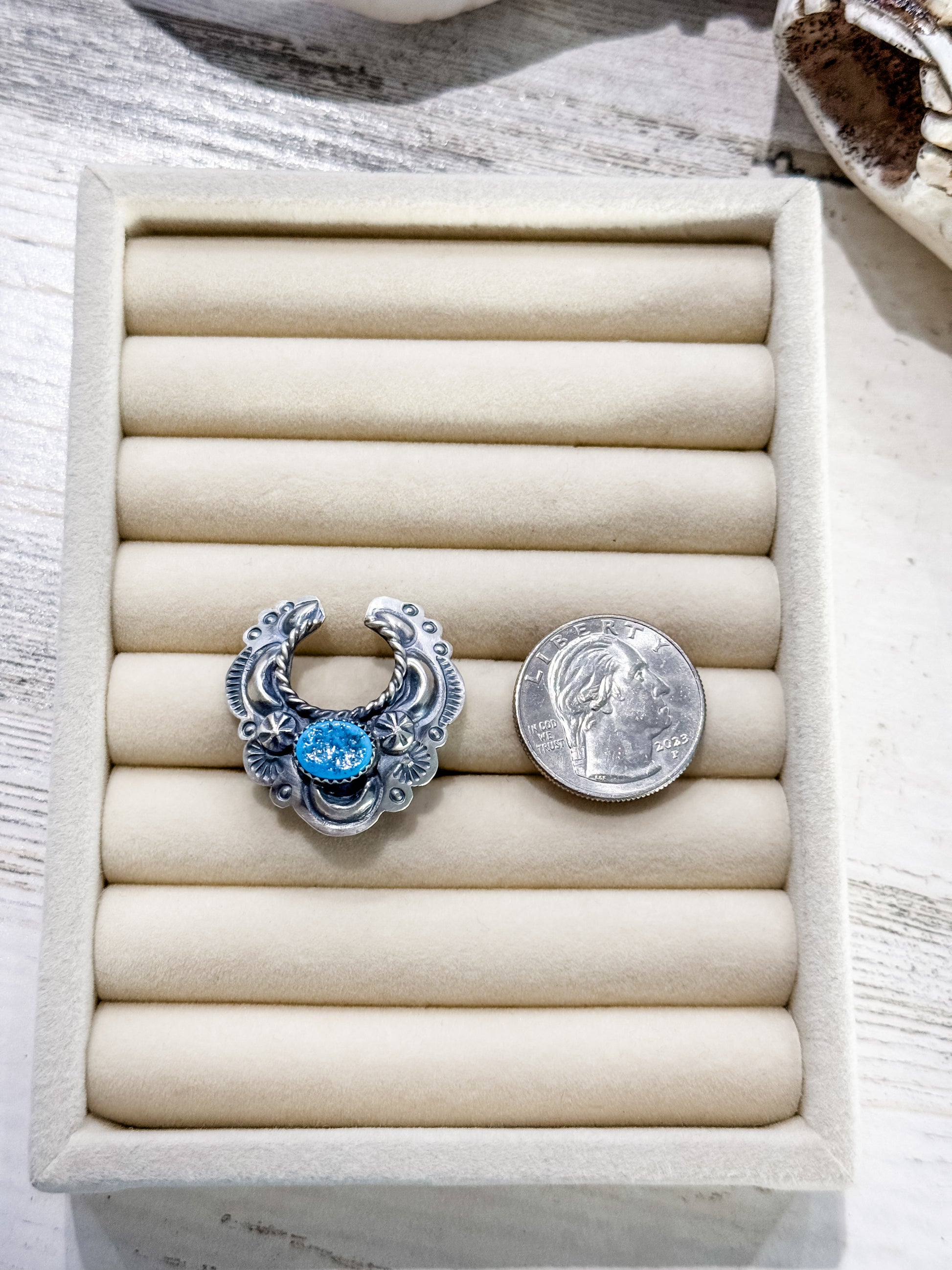 Celebrate heritage and craftsmanship with this handcrafted sterling silver and turquoise horseshoe ring by renowned Navajo silversmith Loretta Chee signed T Yazzie. Loretta is using her husbands stamp until she received her own.