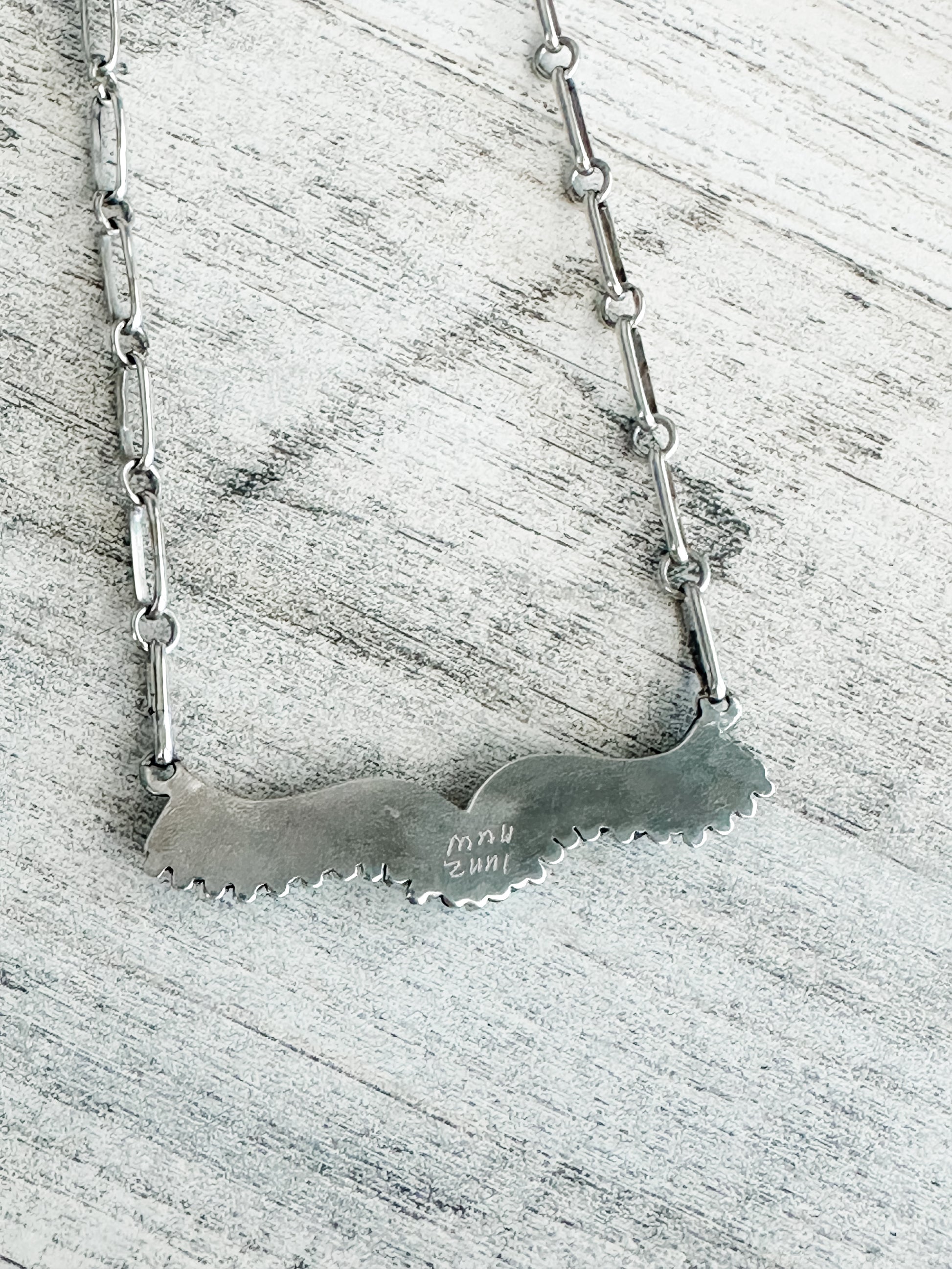 The necklace features a striking turquoise pendant that captures the rich blue-green hues the stone is celebrated for, beautifully accented by the matching earrings. This handcrafted set blends traditional Native design with contemporary wearability, making it a versatile addition to any jewelry collection.